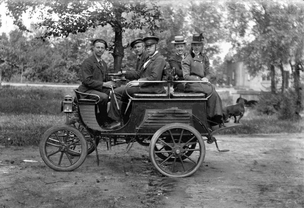 De vraag wie de eerste automobilist van het land was, valt niet met zekerheid te beantwoorden. Aanvankelijk werd gedacht dat fotograaf Zimmermans uit Arnhem deze titel verdiende omdat hij in 1896 een Benz Victoria bestuurde, dat de eerste benzineauto op vier wielen was. Echter, in 1996 onthulde de journalist Marius van Melle dat al eind 1895 Jos Bogaers, een jonge textielfabrikant uit Noord-Brabant, in een auto reed. Er kunnen echter meer vroege automobilisten zijn geweest, daar een landelijk kentekenregister pas in 1898 werd ingevoerd. In Enschede was de autopionier in ieder geval W.H. ‘Helmich’ van Heek (1866-1929), die sinds 1899 rondreed in een Benz Comfortable met kenteken ’70’. In Goor onderscheidde G.J. ‘Jan’ Jannink (1844-1912) zich als eerste automobilist met kenteken ‘222’, nadat hij in 1900 twee voertuigen kocht van de Arnhemse machinefabriek Gelria. Op de foto zien we Jan’s oudste zoon Nic achter het stuur, naast compagnon Hermann Reerink, met bolhoed. Beiden waren firmanten der textielfirma Arntzenius, Jannink & Co, dat destijds bekend stond om haar nettenweverij in Goor en bontweverij in Wierden.