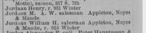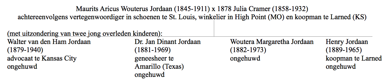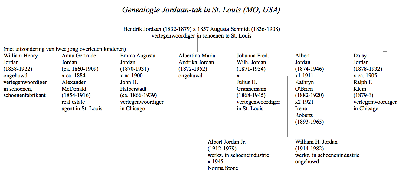 1 William Henry Jordaan, geboren St. Louis oktober 1858, salesman fa. Appleton, Noyes & Co 1878-1879, fa. Bryan, Brown & Co 1880-1881, Bryan-Brown Shoe Co. 1882-1886, Brown-Desnoyers Shoe Co. 1887-1889, vice-president Walden-Parcels-Jordan Shoe Company 1889-1893, president Parcels-Jordan Shoe Co. 1893-1894, vice-president Blasland-Parcels-Jordan Shoe Co. 1894-1895, salesman Peters Shoe Co. 1896-1904 en Brown Shoe Co. 1904- , begraven 7 december 1922 op de Bellefontaine Cemetery.