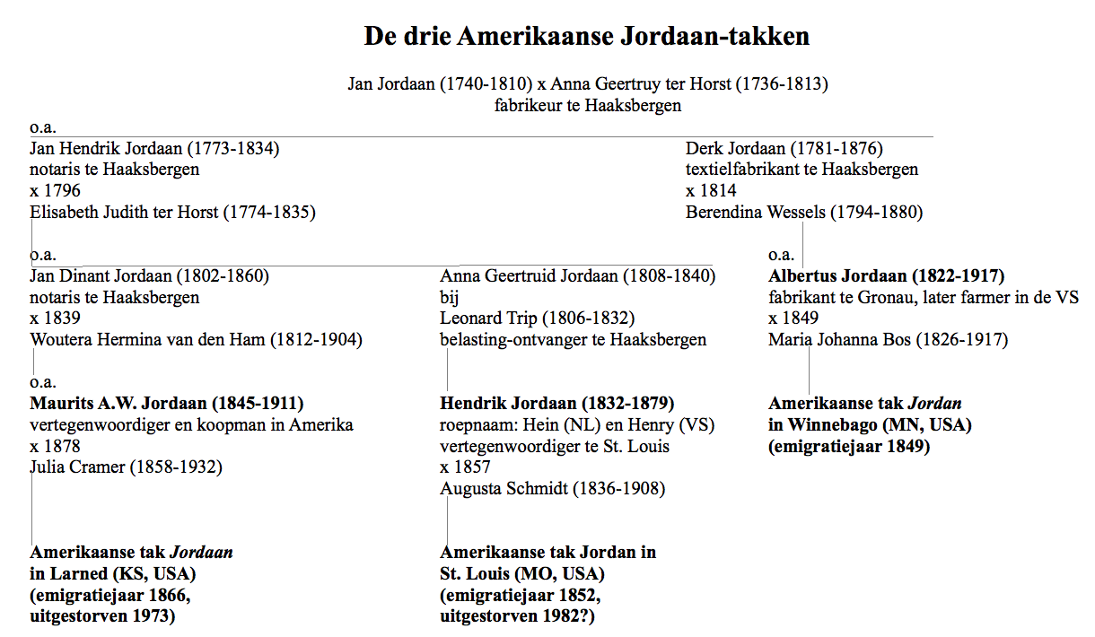 In de jaren ’40 van de negentiende eeuw werd de familie Jordaan opnieuw opgeschrikt door een gevoelige affaire. Ditmaal viel de eer te beurt aan de textieltak Jordaan. Albertus Jordaan (1822-1917, alias Oom Bats), zoon van voornoemde Derk Jordaan en Berendina Wessels, was textielfabrikant net over de grens in Gronau. Hij had zijn oog laten vallen op een Duitse katholieke schone die in 1847 te Vreden beviel van een dochtertje. Oom Bats’ zijn dochtertje wel te verstaan! Opnieuw zat de familie Jordaan met de handen in het haar. Toen ook nog de moeder van het kindje overleed, was er voor de familie geen ontkennen meer aan. Oom Bats nam de zorg voor het meisje op zich en had – vermoed ik – geen boodschap aan de scheve ogen in Twente. Hij gooide in 1849 het roer compleet om en zette koers op… de Verenigde Staten van Amerika! Hoe het oom Bats en zijn dochtertje verder is vergaan, zal ik in een ander artikel beschrijven.