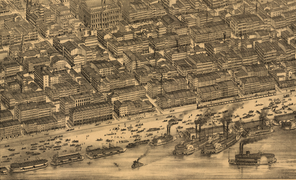 The two big iron chimneys at the front end of the boat certainly do make quite a showing. But on closer examination it all breaks down, and you discover once again that everything is only built to make do. For that matter, such a boat can be built very fast, and it is used for hauling freight even before it is finished. Imagine for yourselves a big Amsterdam barge with a ceiling deck built on one side. The engine is located here, and it is also the area that accommodates the deck passengers, the freights, and the sailors. A ceiling, resting on a few miserable posts, has been nailed in place above it, so that you just cannot understand how it can carry the load above. The deck timbers of this ceiling and two-by-fours (at the two inches thick and four to five inches wide), and on this ceiling small rooms have been built with bunks for the passengers. Together these cabins form an inner chamber where you can sit and eat; it is the fanciest part of the boat. Above this, behind the chimneys, there is a small wooden structure for the steersman. At the forward end the boat is entirely open, at the back end there were (supposed to be) two doors, but one was gone so that there was always a wind blowing from the back to front and vice versa, and so we suffered much from the cold. You either sleep on the floor or on the chests. At times there was so much steam that you could not see each other. (…) We finally arrived at St. Louis, a big mercantile city. There was a host of steamboats anchored there. The city is not attractive , and on the river side it looks as though an earthquake had shaken the ground.”vii