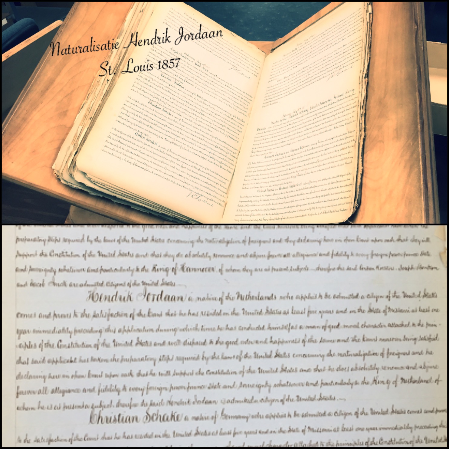 1857 was tevens het jaar dat Henry in het huwelijk trad. Op zondag 4 januari 1857 trouwde hij in de German Presbyterian Church met de Duitse Augusta Schmidt (1836-1908). Haar ouders waren een van de velen Duitsers die zich in de negentiende eeuw vestigden in St. Louis. De wijk Dutchtown12 verwijst naar die grote ‘Deutsche’ gemeenschap. Andere grote buitenlandse gemeenschappen waren de Ieren, geconcentreerd in de wijk ‘Kerry Patch’, en later ook de Italianen, die zich vooral schaarden in de wijk ‘The Hill’. De Nederlandse gemeenschap bleef een kleine, onbeduidende minderheid van St. Louis. Desalniettemin kende de Nederlandse gemeenschap in 1857 wel korte tijd een eigen predikant, al was die predikant zelf ook een Duitser van geboorte. Deze Friedrich Delveau (1812-1885)xii 13 was tot 1857 Pastor of the Dutch Presbyterian Church en ondertekende samen met de getuigen Eildert Derks Diekenga en mevrouw Christiane Streit de huwelijksakte van Henry en Augusta. Op 15 juli 1857 volgde de naturalisatie van Henry Jordaan tot Amerikaans staatsburger.
