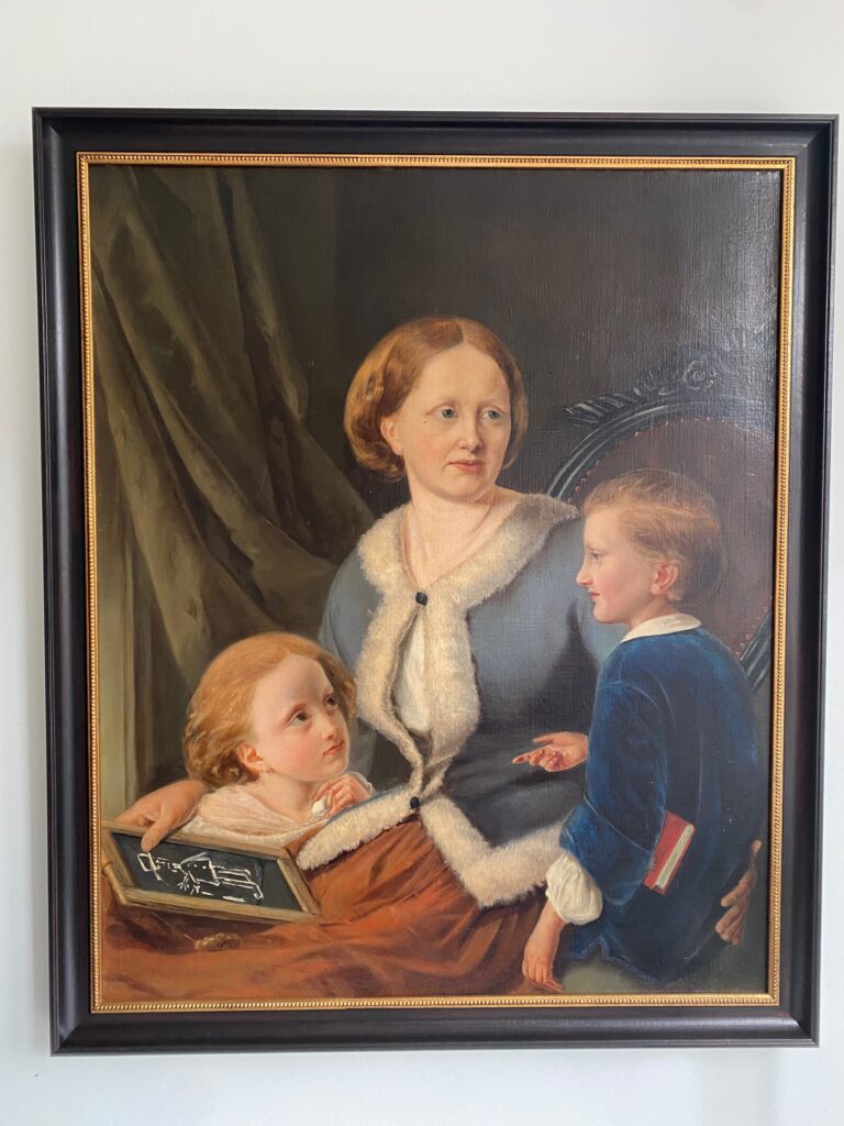 Het jaar 1858 is pas net begonnen wanneer de 34-jarige Lida van Heek-Blijdenstein haar schoonzuster Mietje Ledeboer-van Heek en haar twee kinderen, Mietje en Arnold, vereeuwigt op doek. Eerder had ze haar neefje Bernard Ledeboer al geschilderd met diens favoriete huisdier – een wit konijn. Lida had het schilderen geleerd in Amsterdam en Parijs, en dankzij haar vaste hand weten we vandaag hoe haar familieleden er werkelijk uitzagen: met zachte gelaatstrekken, natuurlijke kleuren en het kenmerkende rossige haar dat in meerdere generaties Ledeboer en Van Heek zou terugkeren. Over de totstandkoming van dit familieportret weten we uitzonderlijk veel, dankzij een brief van de elfjarige Arnold aan zijn broer Bram, die op het gymnasium in Deventer zat.