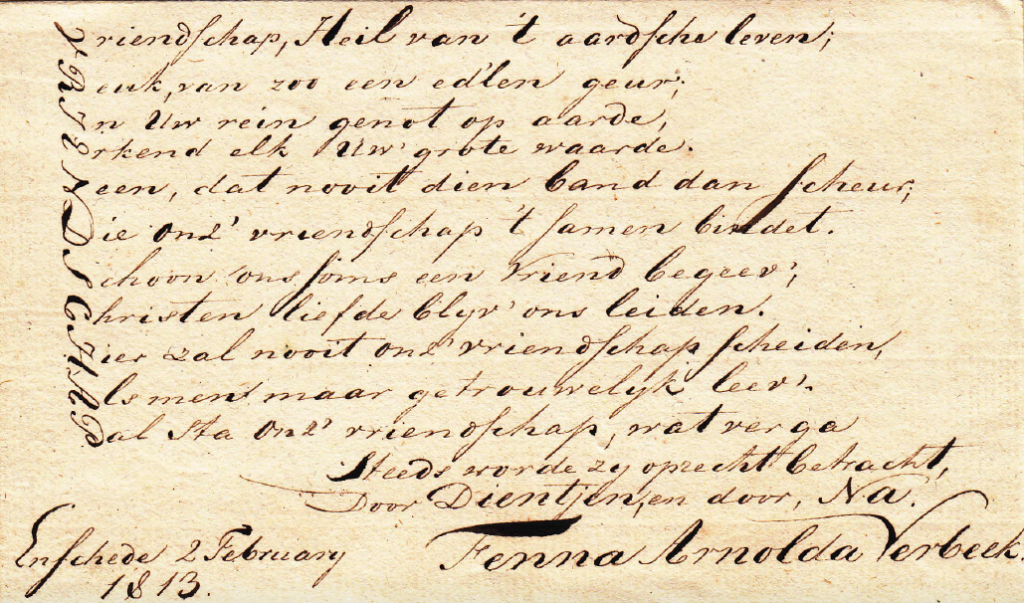 Een van Fenna’s jeugdvriendinnen was haar toekomstige schoonzuster Dientje Ledeboer, die sinds 1811 een poëzie-album bijhield. Twee fraaie bijdragen werden in sierlijk handschrift opgetekend door Fenna in 1813, waaronder het onderstaande gedichtje: