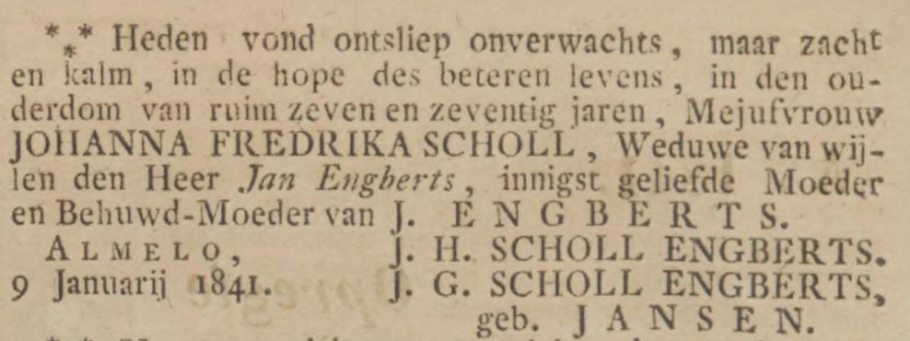 Op 9 januari 1841 overleed de 77-jarige Johanna Frederika Engberts-Scholl in haar woonhuis bij de Koornmarkt in Almelo. Zij behoorde tot de zg. ‘Ruslui’, van oorsprong boerenfamilies uit Vriezenveen die met groot succes handel dreven in onder meer textiel te St. Petersburg. Dit betekende dat de mannen het merendeel van het jaar in Rusland woonden, terwijl de boerderij in Vriezenveen door de vrouwen werd gemanaged. Dit maakte de Vriezenveense vrouwen zeer zelfstandig en ondernemend. Alles werd goed bijgehouden en men stelde elkaar via briefwisseling op de hoogte van het wel en wee in Nederland en Rusland. Een van de laatste wensen van Johanna Frederika was dat de ‘familiepapieren, documenten en aantekeningen’ goed bewaard zouden blijven voor het nageslacht…