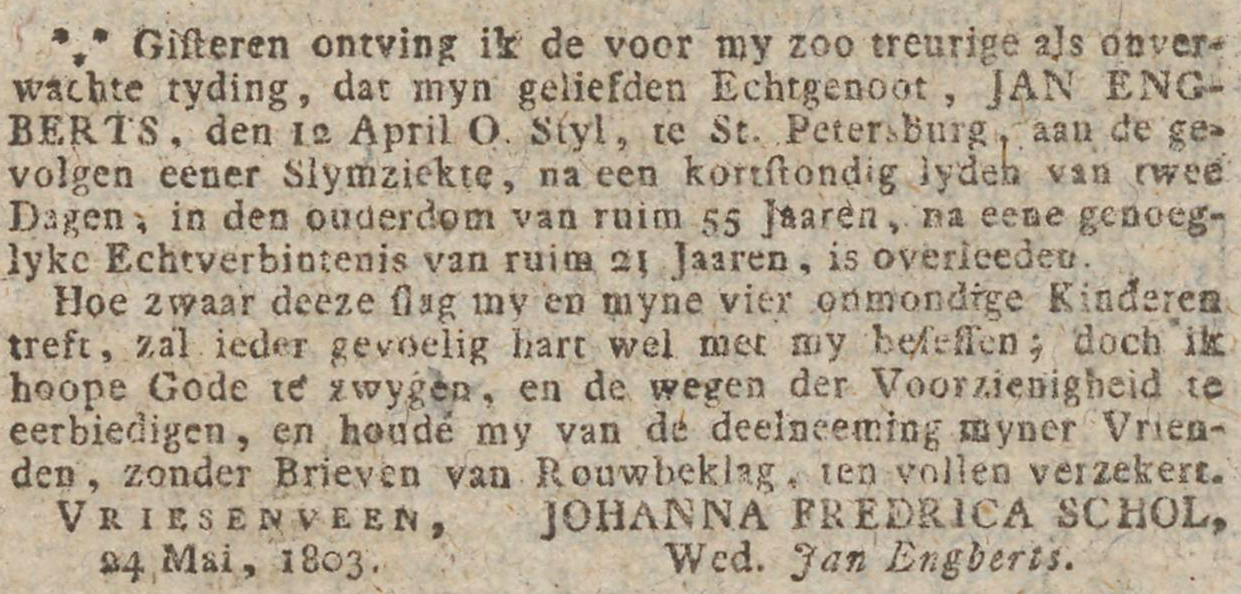 Uit het huwelijk van Johanna Frederika en Jan Engberts werden in Vriezenveen zeven kinderen geboren, waarvan drie zonen en een dochter de volwassen leeftijd wisten te bereiken. Kleine kans dat echtgenoot Jan bij de geboorten en overlijdens van de kinderen aanwezig was. Anderhalf jaar na de geboorte van de jongste zoon, J. H. ‘Hendrik’ Scholl Engberts (1801-1857), vernam Johanna Frederika dat haar echtgenoot in St. Petersburg was overleden.