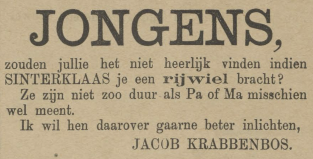 Een paar jaar na deze advertentie, in 1897, sprak de Nieuwe Hengeloosche Courant ook over het wedijveren in ’t uitstallen van de winkels in Goor, maar ook dat het Sinterklaasfeest elk jaar weer met grotere deelneming werd gevierd. Het artikel besloot met de wens dat ‘het ook schoon zou zijn, als men in onze wijken der armoede zou moeten denken, dat de goede Nicolaas onsterfelijk is’.iii