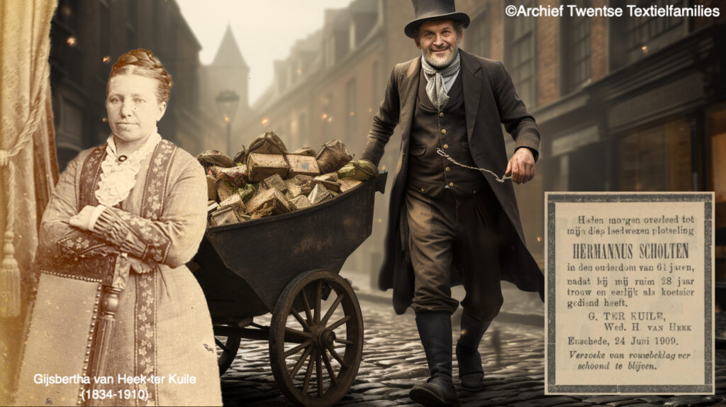 - The fictional depiction of the coachman with the wheelbarrow is purely illustrative. The portrait of Gijs van Heek-ter Kuile is from the Twente Textile Families Archive, and the obituary of Hermannus Scholten was found in the Tubantia newspaper, dated June 24, 1909