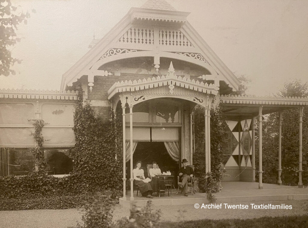 Deze foto dateert uit ongeveer 1896 en is een van de nieuwste aanvullingen op het Archief Twentse Textielfamilies. Op de veranda van het buitenhuisje zitten Dorus en Anna Roessingh-Scholten, vergezeld door hun enige dochter Tini. Deze foto werd onlangs, tezamen met andere documenten, geschonken door hun achterkleinzoon, de heer A.E. Jaarsma. Onder deze documenten bevindt zich een boekje dat Dorus in 1893 samenstelde, waarin hij de aankoop van de grond en de bouw van ‘de kamer met keuken en kelder’ uitvoerig beschrijft. Dit unieke materiaal vormt een waardevolle toevoeging aan de reeds in ons bezit zijnde familiepapieren Roessingh.